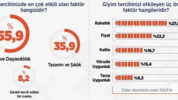 Giyim tercihinizi etkileyen 3 önemli faktörün de sorulduğu araştırmaya göre, vatandaşların yüzde 27.6'sı rahatlık cevabı verdi. Rahatlık cevabını, yüzde 22.2 ile fiyat, yüzde 16.7 ile kalite, yüzde 15.4 vücuda uygunluk ve yüzde 9.3 ile tarza uygunluk yanıtları takip etti. Giyim tarzını etkileyen faktörler arasında 'marka yanıtı verenlerin oranı yüzde 4, tasarım ise 1.7 olurken, işlevsellik diyenlerin oranı yüzde 1.2'de kaldı. Katılımcıların yüzde 1'i, giyim tercihlerinde reklamın önemli olduğunu ifade etti.