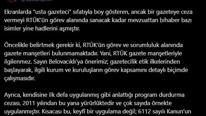 'Ekranlarda 'usta gazeteci' sıfatıyla boy gösteren, ancak bir gazeteye ceza vermeyi RTÜK'ün görev alanında sanacak kadar mevzuattan bihaber bazı isimler yine hadlerini aşmıştır. Öncelikle belirtmek gerekir ki, RTÜK'ün görev ve sorumluluk alanında gazete manşetleri bulunmamaktadır. Yani, RTÜK gazete manşetleriyle ilgilenmez. Sayın Belovacıklı'ya önerimiz; gazetecilik etik ilkelerinden başlayarak, ilgili kurum ve kuruluşların görev kapsamını detaylı biçimde çalışmasıdır. Ayrıca, kendisine ilk defa uygulanmış gibi anlattığı program durdurma cezası, 2011 yılından bu yana yürürlüktedir ve çok sayıda örnekte uygulanmıştır. Kısacası bu, keyfi bir uygulama değil; 6112 sayılı Kanun'un 32. maddesi uyarınca uygulanan açık bir yasal düzenlemedir.'