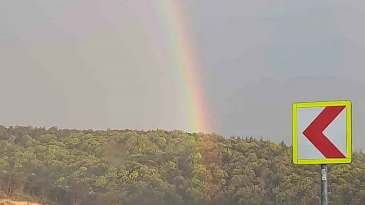 Sağanak yağış sonrası çıkan gökkuşağı renkli görüntüler oluşturdu