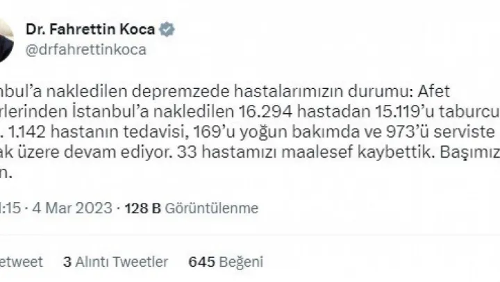Sağlık Bakanı Fahrettin Koca, 'Afet şehirlerinden İstanbul'a nakledilen 16 bin 294 hastadan 15 bin 119'u taburcu oldu. 33 hastamızı maalesef kaybettik. Başımız sağ olsun' dedi.