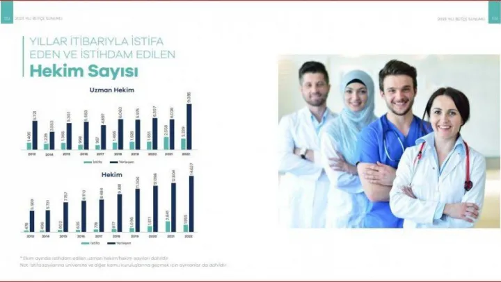 İstifa eden uzman hekim sayısı 2013'te bin 405, 2014'te bin 229, 2015'te bin 365, 2016'da 998, 2017'de 957, 2018'de bin 466, 2019'da bin 626, 2020'de bin 651, 2021'de 2 bin 558, 2022 yılında ise 2 bin 239 oldu. Buna karşın 2013'te 5 bin 721, 2014'te 3 bin 553, 2015'te 5 bin 301, 2016'da 5 bin 563, 2017'de 4 bin 897, 2018'de 6 bin 63, 2019'da 5 bin 975, 2020 yılında 6 bin 307, 2021'de 6 bin 26, 2022'de ise 9 bin 86 uzman hekim göreve başladı.