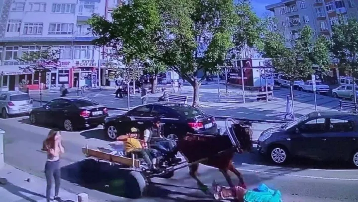 Tekirdağ Çorlu'da ters yöne girerek 4 nala koşan atın, yoldan geçen yayaya çarptığı anlar anbean kameraya yansıdı. Kaza sonrası at arabalı şahıslar bir süre sonra olay yerini terk ederken, yaralanan kadın ise hastaneye kaldırıldı.