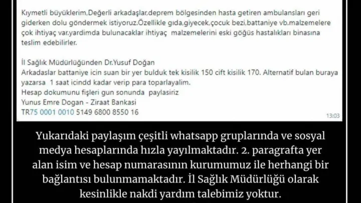Açıklamada, Whatsapp ve sosyal medya gruplarında 'İl sağlık müdürlüğünden paylaşılan teyitli mesajdır. Kıymetli büyüklerim, değerli arkadaşlar, deprem bölgesinden hasta getiren ambulansları geri giderken dolu göndermek istiyoruz. Özellikle gıda, giyecek, çocuk bezi, battaniye gibi malzemelere çok ihtiyaç var. Yardımda bulunacaklar ihtiyaç malzemelerini eski göğüs hastalıkları binasına teslim edebilirler. İl Sağlık Müdürlüğünden Dr. Yusuf Doğan. Arkadaşlar battaniye için şuan bir yer bulduk. Tek kişilik 150, çift kişilik 170. Alternatif bulan buraya yazarsa 1 saat içinde kaıar verip para toparlayalım. Hesap dökümünü, fişleri gün sonunda paylaşırız. Yunus Emre Doğan - Ziraat Bankası- TR75 0001 0010 5149 6800 8550 16' mesajının paylaşıldığı hatırlatılarak, bunun kurumla ilgili olmadığı belirtildi. Vatandaşlara uyarılarda bulunulan açıklama şu şekilde: