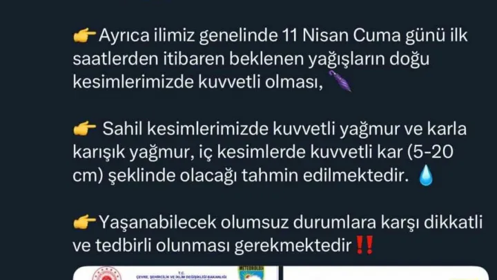 Sakarya Valiliği, meteorolojik verilere göre şehrin sahil kesimlerinde etkili olması beklenen fırtına ile yağışa karşı uyarılarda bulundu. Valilik tarafından yapılan paylaşımda, 'Meteoroloji verilerine göre; ilimizde rüzgarın bugün akşam saatlerinden sonra, sahil kesimlerimizde kuzey ve kuzeybatıdan 6 ila 8 kuvvetinde (50-75 km/saat) fırtına şeklinde eseceği, ayrıca ilimiz genelinde 11 Nisan Cuma günü ilk saatlerden itibaren beklenen yağışların doğu kesimlerimizde kuvvetli olması, sahil kesimlerimizde kuvvetli yağmur ve karla karışık yağmur, iç kesimlerde kuvvetli kar (5-20 cm) şeklinde olacağı tahmin edilmektedir. Yaşanabilecek olumsuz durumlara karşı dikkatli ve tedbirli olunması gerekmektedir' ifadelerine yer verildi.