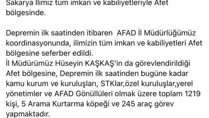 Kahramanmaraş merkezli ve 10 ilde büyük tahribata sebep olan deprem sonrasında Sakarya'dan birçok kamu, kuruluş bölgeye gitmek ve yardım etmek için seferber oldu. Bu çerçevede AFAD Sakarya İl Müdürlüğü sosyal medyasında şehirden deprem bölgesine giden kurum ve kuruluşların sayısını yayınladı. Sosyal medyada paylaşılan yazıda, 'Sakarya ilimiz tüm imkan ve kabiliyetleriyle Afet bölgesinde. Depremin ilk saatinden itibaren AFAD İl Müdürlüğümüz koordinasyonunda, ilimizin tüm imkan ve kabiliyetleri Afet bölgesine seferber edildi. İl Müdürümüz Hüseyin Kaşkaş'ın da görevlendirildiği afet bölgesine, depremin ilk saatinden bugüne kadar kamu kurum ve kuruluşları, STK'lar, özel kuruluşlar, yerel yönetimler ve AFAD Gönüllüleri olmak üzere toplam bin 219 kişi, 5 arama kurtarma köpeği ve 245 araç görev yapmaktadır' ifadelerine yer verildi.