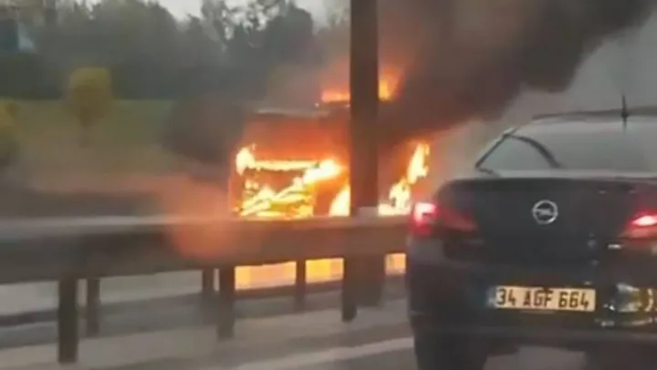 Sancaktepe'de TEM Otoyolu'nda yanan minibüs alev topuna döndü. Minibüsün alev alev yandığı o anlar kameralara yansıdı.