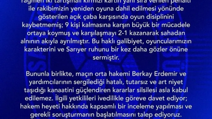 'Kulübümüzün dün karşılaştığı Vanspor mücadelesinde maruz kaldığı taraflı yönetim ve hakem heyetinin kararlarındaki ciddi tutarsızlık, camiamızda büyük bir üzüntü ve şaşkınlık yapmıştır. Takımımız, sahada uygulanan kasıtlı ve yanlı kararlara rağmen iki tartışmalı kırmızı kartın yanı sıra verilen penaltı ile rakibimizin yeniden oyuna dahil edilmesi yönünde gösterilen açık çaba karşısında oyun disiplinini kaybetmemiş; 9 kişi kalmasına karşın büyük bir mücadele ortaya koymuş ve karşılaşmayı 2-1 kazanarak sahadan alnının akıyla ayrılmıştır. Bu haklı galibiyet, oyuncularımızın karakterini ve Sarıyer ruhunu bir kez daha gözler önüne sermiştir. Bununla birlikte, maçın orta hakemi Berkay Erdemir ve yardımcılarının sergilediği hatalı, tutarsız ve art niyet taşıdığı kanaatini güçlendiren kararlar silsilesi asla kabul edilemez. İlgili yetkilileri ivedilikle göreve davet ediyor; hakem heyeti hakkında kapsamlı bir inceleme yapılması ve gerekli soruşturmanın başlatılmasını talep ediyoruz. Galibiyetimizin sevincini yaşarken, benzer kararların gelecekte tekrar etmesi ihtimali bizleri endişelendirmektedir. Sürecin sonuna kadar takipçisi olacağımızı kamuoyuna duyururuz.'