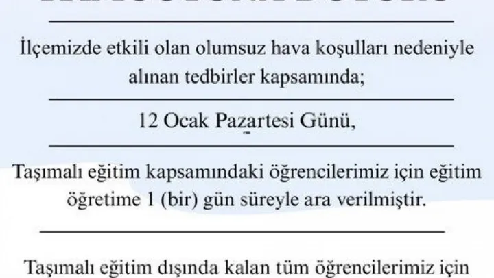 Şarköy İlçe Milli Eğitim Müdürlüğü tarafından yapılan açıklamada, ilçede etkili olan olumsuz hava şartları doğrultusunda alınan tedbirler kapsamında, 12 Ocak 2026 Pazartesi günü taşımalı eğitim kapsamındaki öğrenciler için eğitim-öğretime 1 gün süreyle ara verildiği bildirildi.