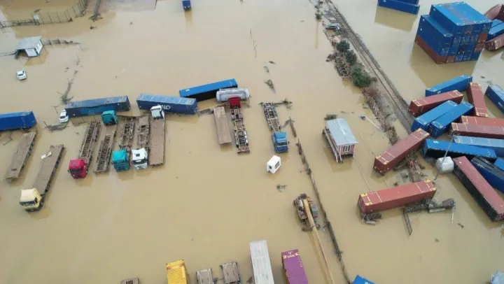 İstanbul'da etkili olan sağanak yağışta sel sularının bastığı İstanbul Halkalı Gümrüğü havadan görüntülendi.