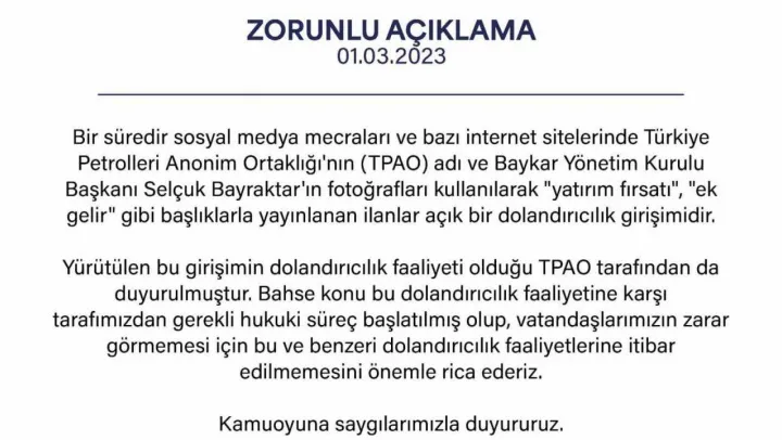 Baykar'dan yapılan açıklamada, 'Bir süredir sosyal medya mecraları ve bazı internet sitelerinde Türkiye Petrolleri Anonim Ortaklığı'nın (TPAO) adı ve Baykar Yönetim Kurulu Başkanı Selçuk Bayraktar'ın fotoğrafları kullanılarak 'yatırım fırsatı', 'ek gelir' gibi başlıklarla yayınlanan ilanlar açık bir dolandırıcılık girişimidir. Yürütülen bu girişimin dolandırıcılık faaliyeti olduğu TPAO tarafından da duyurulmuştur. Bahse konu bu dolandırıcılık faaliyetine karşı tarafımızdan gerekli hukuki süreç başlatılmış olup, vatandaşlarımızın zarar görmemesi için bu ve benzeri dolandırıcılık faaliyetlerine itibar edilmemesini önemle rica ederiz' denildi.