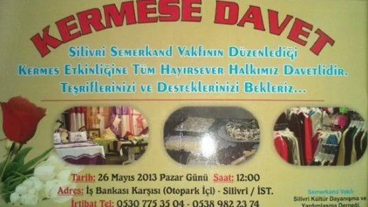 Semerkand Derneği Silivri Şubesi tarafından düzenlenen Kermes 26 Mayıs Pazar günü gerçekleştirilecek.