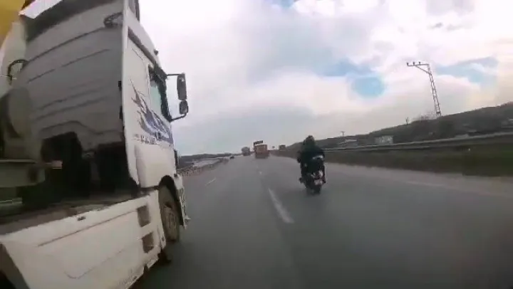 Şile Otoyolunda seyir halinde olan bir motosiklet sürücüsü hafriyat kamyonunun altında kalmaktan son anda kurtuldu. Motosiklet sürücüsünün üzerine kamyonunu süren şoför daha sonra araç camından sigara paketi fırlatarak küfür etti. O anlar motosiklet sürücüsünün kask kamerasına yansıdı.