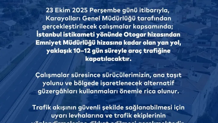 23 Ekim 2025 Perşembe gününden itibaren, Karayolları Genel Müdürlüğü tarafından yürütülecek çalışmalar kapsamında; İstanbul istikameti yönünde, Otogar hizasından Emniyet Müdürlüğü hizasına kadar olan yan yol yaklaşık 10–12 gün süreyle araç trafiğine kapatılacak.