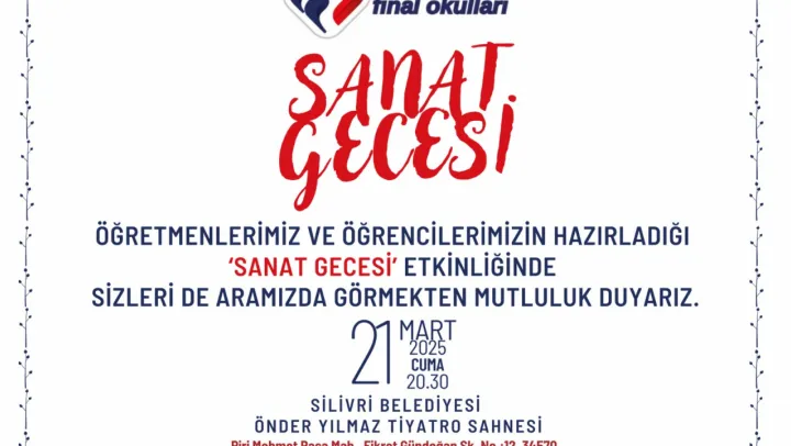 Silivri Final Okulları öğretmen ve öğrencileri, hazırladıkları 'Sanat Gecesi' etkinliği ile sevginin dilini sanatla anlatmaya hazırlanıyor. 21 Mart 2025 Cuma günü Silivri Belediyesi Önder Yılmaz Tiyatro Sahnesi'nde gerçekleşecek etkinlik, tüm Silivri halkına açık olacak.