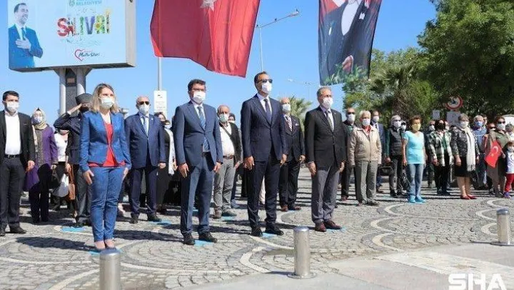Törende saygı duruşu ve İstiklal Marşı'nın okunmasının ardından Gençlik ve Spor İlçe Müdiresi Gürkan Akbıyık, Atatürk Anıtı'na çelenk bıraktı. Siyasi partilerin ilçe başkanlıkları da çelenklerini anıta bıraktı. Çelenklerin Atatürk Anıtı'na bırakılmasının ardından tören sona erdi.