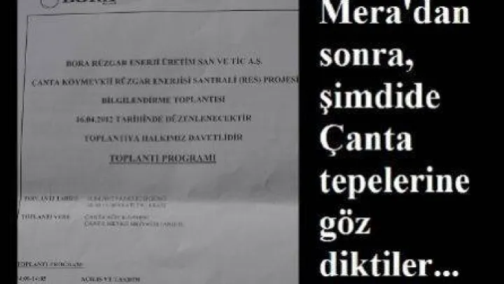 Bora Rüzgar Enerji Üretim San.ve Tic. A.Ş Yetkilileri Derğirmenköy ve Çanta Mahallesi Muhtarlarına bir bilgi notu göndererk, 16 Nisan 2012 tarihinde saat 14: 00 ile 15: 00 arasında Çanta Köy Kahvesinde bilgilendirme toplantısı düzenleyeceklerini bildirdiler.