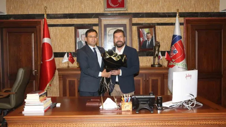 Konuşmaların ardından Sak, Ekrem Yavaş'a çiçek vererek belediye binasından uğurladı.