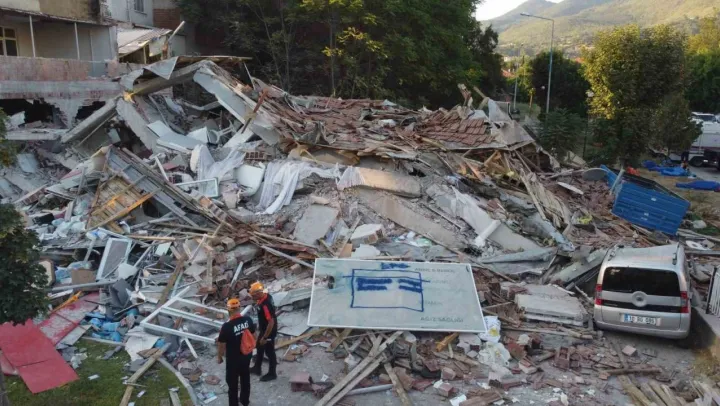Balıkesir'in Sındırgı ilçesinde yaşanan 6.1 büyüklüğündeki deprem nedeniyle yıkılan bina sabahın ilk ışıklarıyla birlikte dron ile havadan görüntülendi.