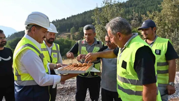 Balıkesir Büyükşehir Belediye Başkanı Yücel Yılmaz, 40 derece sıcağın altında asfalt serimi gerçekleştiren işçilere soğuk meşrubat ve baklava sürprizi yaptı. 'Emektar kardeşlerimizle çok iyi çalışıyoruz' diyen Başkan Yılmaz, 'Sındırgı'da şuana kadar 57 kilometre asfalt serimi gerçekleştirdik, sezon sonuna kadar da 70 kilometre daha asfalt serimi yapacağız' dedi.