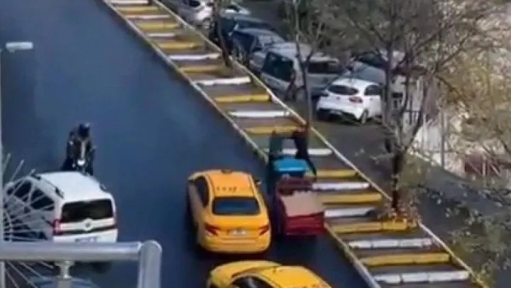 Şişli'de yokuşta aracı hızlanmayan bir kağıt toplayıcısı ile taksi sürücüsü arasında çıkan tartışma kavgaya döndü. Taksi şoförü ile kağıt toplayıcısı arasındaki kavga kameraya yansıdı.