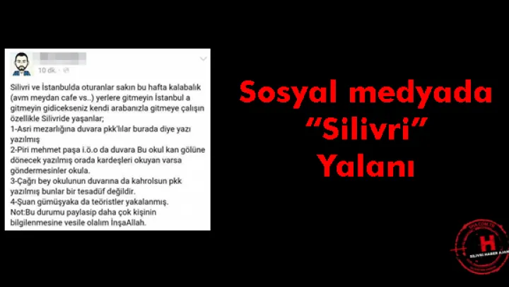 Yetkililer, son birkaç gündür Silivri'de sahte bir hesap üzerinden yapılan paylaşımda “Silivri ve İstanbul'da yaşayan… “ile başlayarak bazı okulların duvarında gerçek dışı bazı yazılması ile devam eden, son olarak ta Gümüşyaka mahallesinde terörist yakalandığı yönündeki bilgilerin tamamen asılsız olduğu ,sosyal medya üzerinden bu tür asılsız paylaşımlar yaparak halkı gereksiz yere panik ve korkuya sevk edenlerin de tespit edilerek adliyeye sevk edilmesi için gereken çalışmanın yürütüldüğü belirtildi.