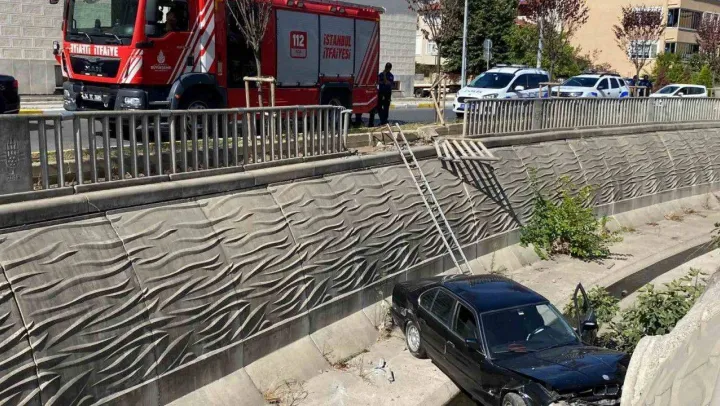 Sultanbeyli'de ehliyetsiz sürücünün kontrolünden çıkan otomobil kanala uçtu. Kazada sürücü burnu bile kanamadan kurtuldu.