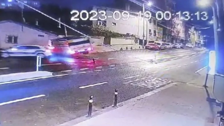 Güvenlik kamerasına yansıyan görüntülerde, yokuş aşağı süratle inen kamyonet cadde üzerinde seyir halindeki polis aracına çarparak ardından aydınlatma direğine ve binaya çarparak duruyor.