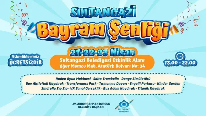 Ramazan ayı boyunca 7'den 70'e herkese hitap edecek etkinlikleri ilçe sakinleriyle buluşturan Sultangazi Belediyesi, bayram hazırlıklarını da tamamladı. Özellikle çocukların unutamayacağı bir bayram geçirmesi için birçok etkinlik hazırlandı. Sultangazi Belediyesi Etkinlik alanına dev bir çocuk oyun alanı kuruldu. İçinde; rodeo oyun makinesi, salto trambolin, denge simülatörü, dev aktiviteli kaydırak, transformers park, tırmanma duvarı, engelli parkuru, kinder garden, sindrella zıp zıp, vr sanal gerçeklik, buz adam kaydırak, titanik kaydırağın bulunduğu oyuncaklar çocuklara bayramı şenlik tadında geçirmelerini sağlayacak. Alan, saat 13.00'den akşam 22.00'a kadar çocuklara hizmet vermeye devam edecek.