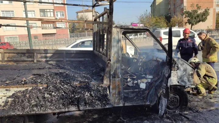 Çıkan yangında alev alan kamyonet kullanılamaz hale gelirken olay anı ise kameraya yansıdı.