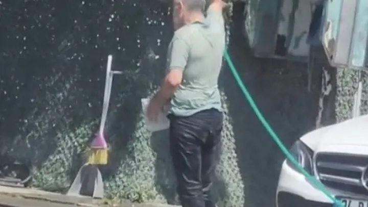 Sultangazi'de sıcaktan bunalan bir vatandaş hortumla hem kendini hem de aracını yıkadı. Vatandaşın serinlemek için hortumla yıkandığı anlar ise cep telefonu kamerasına yansıdı.