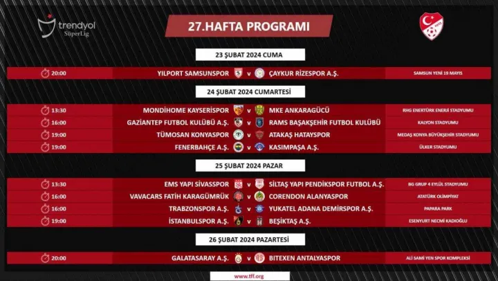 Trendyol Süper Lig'in 27, 28, 29 ve 30. haftalarında oynanacak maçların programı Türkiye Futbol Federasyonu (TFF) tarafından açıklandı. Ligin 28. haftasında Beşiktaş'ın, Galatasaray'ı ağırlayacağı mücadele 3 Mart Pazar günü saat 19.00'da yapılacak. Süper Lig'in 30. haftasında ise Trabzonspor ile Fenerbahçe 17 Mart Pazar günü saat 20.30'da karşı karşıya gelecek.