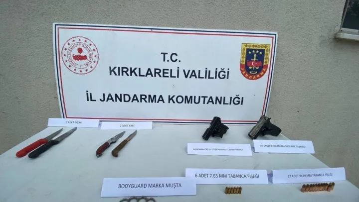 Kırklareli İl Jandarma Komutanlığının önleyici faaliyetleri çerçevesinde Demirköy ilçesinde icra edilen şok yol uygulamasında şüpheli bir araç durduruldu. Araç içerisindeki aramalarda 2 adet tabanca, 2 adet ekmek bıçağı, 1 adet muşta, 1 adet sopa ve 2 adet çakı ele geçirildi.