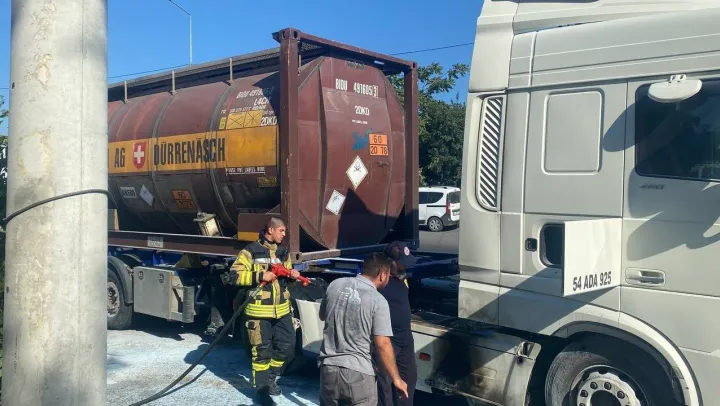 Kocaeli'nin Gebze ilçesinde seyir halindeki kimyasal yüklü tırın kupa kısmında yangın çıktı. Sürücünün dikkati sayesinde facianın önüne geçildi.