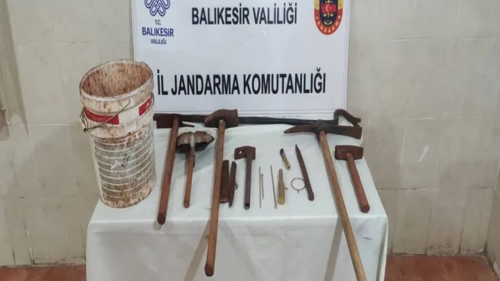 Balıkesir İl Jandarma Komutanlığınca,kültür ve tabiat varlıkları kaçakçılığına yönelik yapılan istihbarı çalışmalar neticesinde,Susurluk ilçesinde izinsiz kazı yapılacağının tespitinin yapılması üzerine bölgede yapılan operasyonel faaliyet sonucu;1 adet çekiç, 1 adet kazma, 1 adet keser, 1 adet murç, 1 adet balyoz, 1 adet kürek, 1 adet çapa, 1 adet kova ve 1 adet su bulma cihazı ele geçirildi. Olaya karışan 5 şüpheli suçüstü yakalanarak gözaltına alındı.