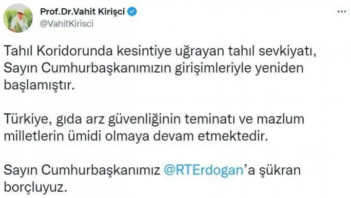 Rusya, geçtiğimiz günlerde tahıl koridorunda gemilerin sevkiyatının durdurulduğunu açıklamıştı. Tarım ve Orman Bakanı Vahit Kirişci, sosyal medya hesabından tahıl koridorunda tekrar sevkiyata başlandığını duyurdu. Kirişci paylaşımında, 'Tahıl koridorunda kesintiye uğrayan tahıl sevkiyatı, Sayın Cumhurbaşkanımızın girişimleriyle yeniden başlamıştır. Türkiye, gıda arz güvenliğinin teminatı ve mazlum milletlerin ümidi olmaya devam etmektedir. Cumhurbaşkanımız Recep Tayyip Erdoğan'a şükran borçluyuz' ifadelerini kullandı.