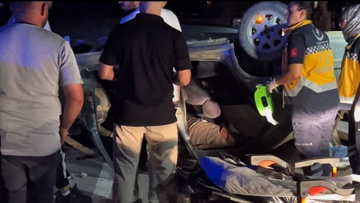 Takla atan otomobilde sıkışan sürücüyü itfaiye ekipleri kurtardı