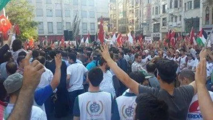 İnsan Hak ve Hürriyetleri (İHH) İnsani Yardım Vakfı, Memur-Sen Genel Başkanlığı ve Genç Memur-Sen İstanbul İl Başkanlığı organizasyonuyla toplanan bir grup, İsrail'in Gazze'ye saldırılarını protesto etti.