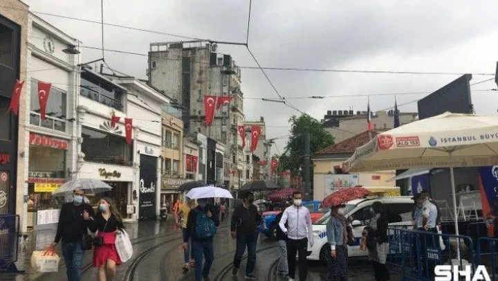 Taksim Meydanı'nda öğle saatlerinde yağış etkili oldu. Yağış, hafta sonu sokağa çıkma kısıtlamasından muaf olan turistlerin meydanda gezmesine engel olmadı. Meteoroloji Genel Müdürlüğü, İstanbul için sağanak yağmur uyarısı yapmıştı. Taksim Meydanı'nda da saat 14.30 sıralarında yağış etkili oldu. Yağış, hafta sonu sokağa çıkma kısıtlamasından muaf olan turistlerin meydanda gezmesine engel olmadı. Bazı vatandaşlar yağmurun dinmesini durakta ya da mekanların önünde beklerken bazı vatandaşlar da şemsiyesiyle meydanda gezmeye devam etti.