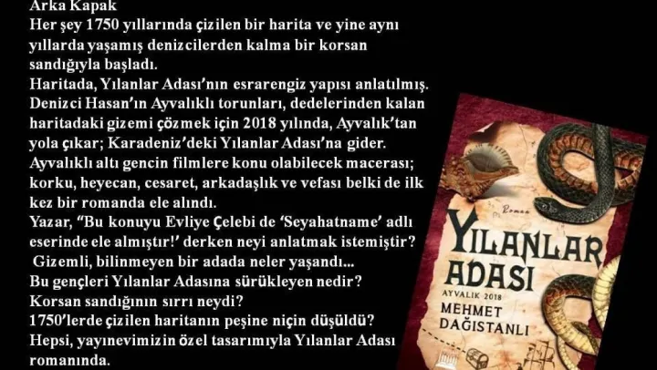 Kitap; aslen Ayvalıklı olan Hasan, kız kardeşi Nesrin, arkadaşları Turgay, Turgay'ın kız kardeşi Pelin, Aziz, Demirhan isimli denizci gençlerden Hasan'ın dedesi Cahit Kaptan'ın kendi tuttuğu notlarından ve tesadüfen bir gün de aynı olayı Evliya Çelebinin Seyahatnamesinde okumasının ardından, Altı gencin; 1750 yıllarında çizilen bir harita da Yılanlar Adası'nın esrarengiz yapısını çözebilmek için 2018 yılında, Ayvalık'tan yola çıkarak Karadeniz'deki Yılanlar Adası'na gitmelerini anlatıyor.