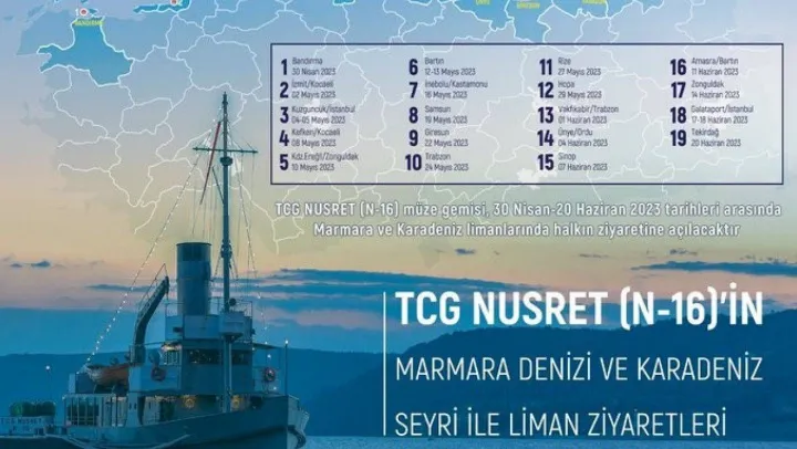 Milli Savunma Bakanlığı (MSB) sosyal medya hesabından yapılan paylaşımda, 'TCG NUSRET müze gemimiz, 30 Nisan-20 Haziran 2023 tarihleri arasında Marmara ve Karadeniz limanlarında halkımızın ziyaretine açılacaktır' ifadeleri kullanıldı.