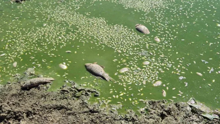 Tekirdağ'ın Süleymanpaşa ilçesine bağlı Yağcı Mahallesi'nde Çakıl Göleti tamamen kurudu, göletteki balıklar susuzluktan öldü.