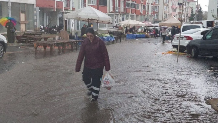 Tekirdağ'ın Süleymanpaşa ilçesinde aniden bastıran şiddetli yağış pazar alanını sular altında bırakırken sokaklar adeta dereye dönüştü.