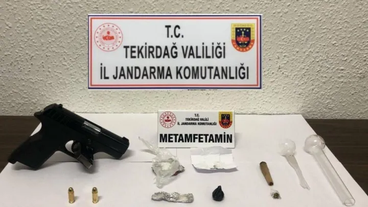 Jandarma ekipleri, şahısların üzerlerinde ve araçlarında yaptığı aramada, 8 gram metamfetamin, 2 gram esrar, 2 uyuşturucu madde kullanma aparatı, ruhsatsız tabanca, 2 tabanca mermisi ele geçirildi.