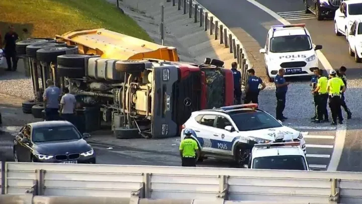 Hasdal TEM bağlantı yolunda virajı alamayan hafriyat kamyonu devrildi. Kaza nedeniyle kamyonun içinde bulunan 2 kişi yaralanarak hastaneye kaldırıldı.