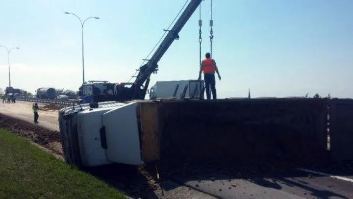 Büyükçekmece TEM Otoyolu üzerinde aşırı hızlı gittiği iddia edilen toprak yüklü hafriyat kamyonu devrildi. Kazada sürücü hafif şekilde yaralanırken, TEM Otoyolu Edirne istikameti yaklaşık 2 saat trafiğe kapandı.