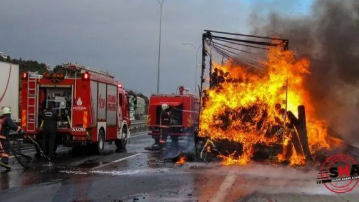 TEM otoyolu İstanbul istikametinde seyir halindeki kumaş yüklü tır cayır cayır yandı.