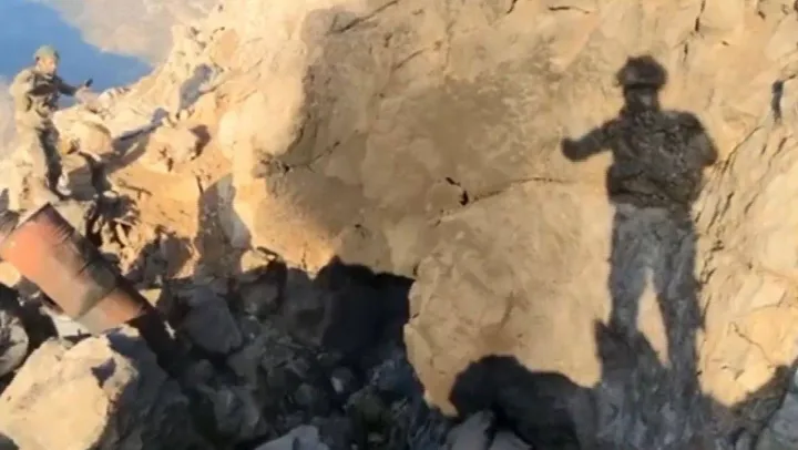Komandoların etrafını sardığı, zorlu ve kayalık arazide bulunan mağaradaki teröristler ellerini kaldırarak tek tek mağaradan çıktı. Mehmetçik gerekli güvenlik önlemlerini alırken, bir askerin 'Türk askeri aman dileyene, teslim olana asla zarar vermez' ifadesi de görüntülerde yer aldı.