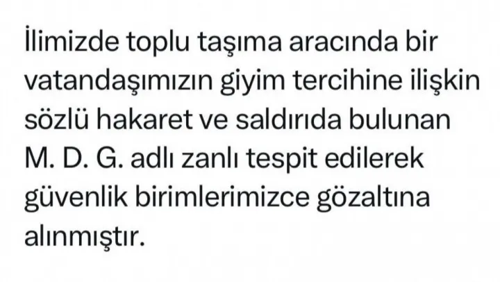 Kocaeli Valisi Seddar Yavuz, sosyal medya hesabından yaptığı açıklamada, 'İlimizde toplu taşıma aracında bir vatandaşımızın giyim tercihine ilişkin sözlü hakaret ve saldırıda bulunan M.D.G. adlı zanlı tespit edilerek güvenlik birimlerimizce gözaltına alınmıştır. Bireysel hak ve özgürlükleri korumaya kararlıyız' dedi.