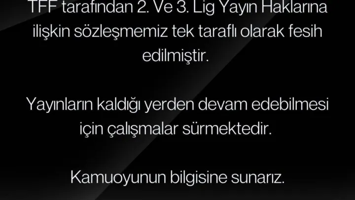 Fuchs Sports, TFF 2. Lig ve TFF 3. Lig yayın haklarını kapsayan sözleşmenin Türkiye Futbol Federasyonu tarafından feshedildiğini duyurdu. Konuyla ilgili Fuchs Sports'un sosyal medya hesabından yapılan açıklamada, 'TFF tarafından 2. ve 3. Lig yayın haklarına ilişkin sözleşmemiz tek taraflı olarak fesih edilmiştir. Yayınların kaldığı yerden devam edebilmesi için çalışmalar sürmektedir. Kamuoyunun bilgisine sunarız' denildi.