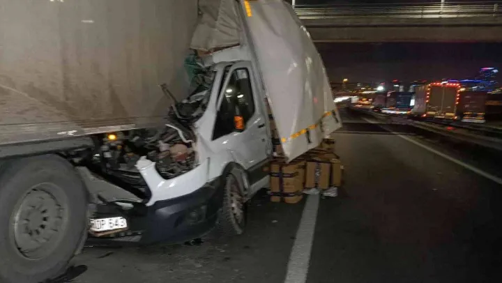 Beylikdüzü'nde park halindeki tıra arkadan çarpan kamyon sürücüsü, aracının kaputunun ezilmesine rağmen burnu bile kanamadan kamyondan çıktı. Kaza sonrası polis ekipleri bölgeye gelirken trafik bir süre tek şeritte ilerledi.
